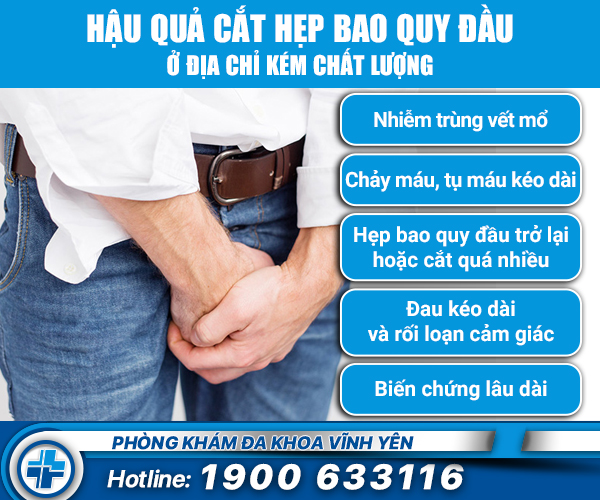 Khi cắt hẹp bao quy đầu ở địa chỉ kém chất lượng có thể dẫn đến nhiều hậu quả nghiêm trọng, ảnh hưởng trực tiếp đến sức khỏe, sinh lý và khả năng sinh sản như: