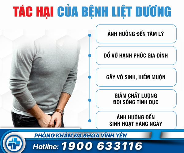 Theo bác sĩ nam khoa tại Phòng khám đa khoa Vĩnh Yên: “Liệt dương ở nam giới có thể do nhiều nguyên nhân gây ra, trong đó bệnh lý là nguyên nhân hàng đầu. Nếu bệnh lý không điều trị kịp thời và hiệu quả, bệnh sẽ nhanh chóng trở nặng, khiến nam giới không thể quan hệ tình dục được do dương vật mất khả năng cương cứng”.